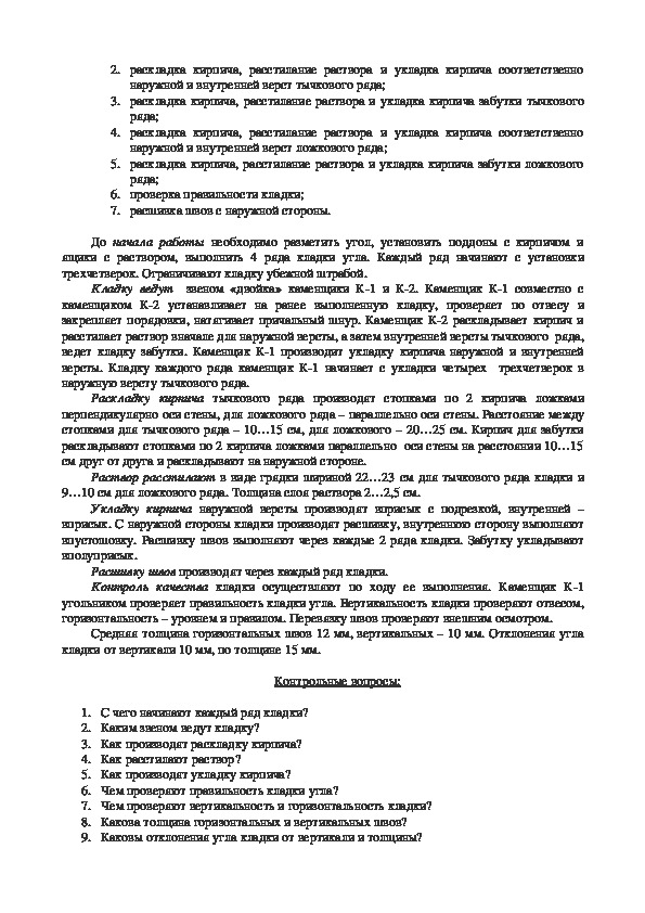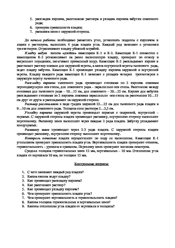 1. Формирование первоначальных умений выполнения операций по кладке углов стен