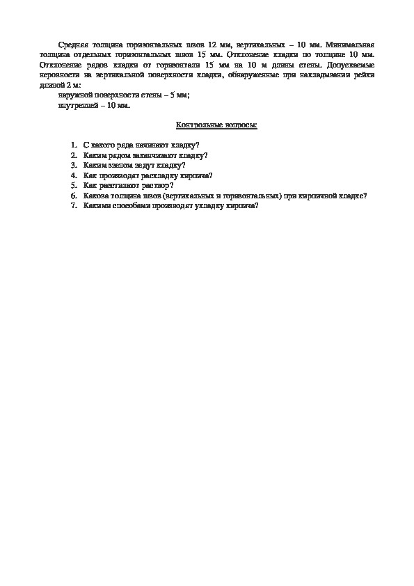Средняя толщина горизонтальных швов 12 мм, вертикальных – 10 мм. Минимальная