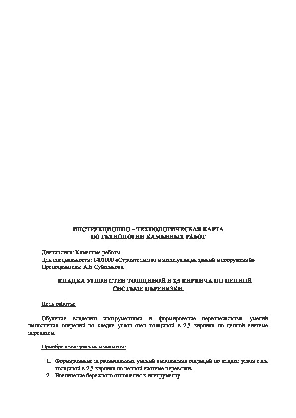 9 Каковы отклонения угла кладки от вертикали и толщины?ИНСТРУКЦИОННО – ТЕХНОЛОГИЧЕСКАЯ КАРТА