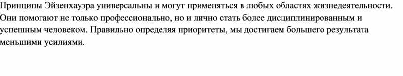 Принципы Эйзенхауэра универсальны и могут применяться в любых областях жизнедеятельности. Они помогают не только профессионально, но и лично стать более дисциплинированным и успешным человеком. Правильно определяя приоритеты, мы достигаем большего результата меньшими усилиями.