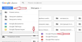 После того, как перешли на диск, Слева вверху нажимаете кнопку – СОЗДАТЬ. В открывшемся окне видны не все возможности, поэтому нажимаете на «Еще» и выбираете Google Формы.