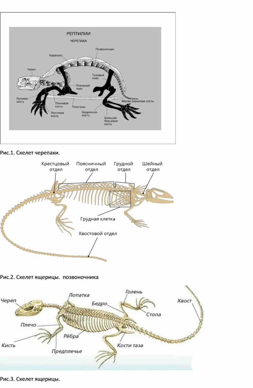 Цель: изучить (на примере скелетов черепахи, ящерицы и змеи) особенности строения скелетов пресмыкающихся, выявить черты сходства и различия.