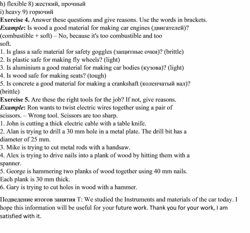 Цель урока: Teacher: Good afternoon, students! Sit down, please. Today at our lesson we shall read and talk about the instruments and materials of the car.