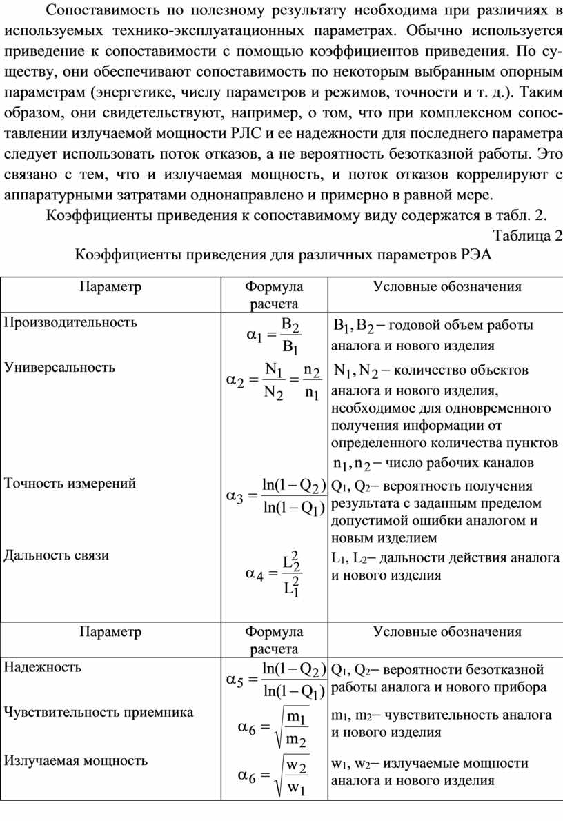 Сопоставимость по полезному результату необходима при различиях в используемых технико-эксплуатационных параметрах. Обычно используется приведение к сопоставимости с помощью коэффициентов приведения. По существу, они обеспечивают сопоставимость по некоторым выбранным опорным параметрам (энергетике, числу параметров и режимов, точности и т. д.). Таким образом, они свидетельствуют, например, о том, что при комплексном сопоставлении излучаемой мощности РЛС и ее надежности для последнего параметра следует использовать поток отказов, а не вероятность безотказной работы. Это связано с тем, что и излучаемая мощность, и поток отказов коррелируют с аппаратурными затратами однонаправлено и примерно в равной мере.