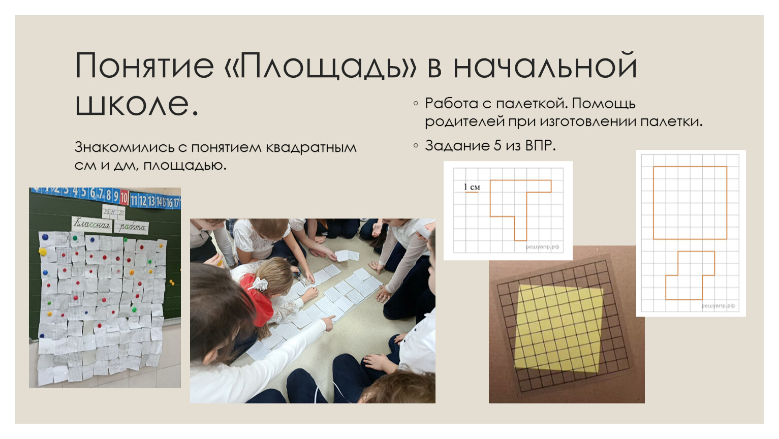 А на следующем уроке мы сделали вывод, что площадь – это не весь предмет со всех сторон, а только плоскость в границах контура.
