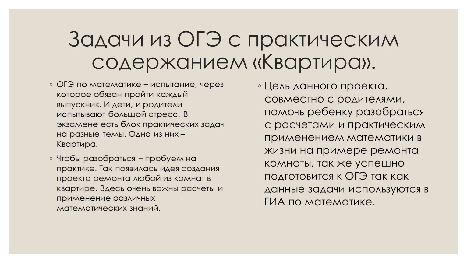 Цель данного проекта, совместно с родителями, помочь ребенку разобраться с расчетами и практическим применением математики в жизни на примере ремонта комнаты, так же успешно подготовится к ОГЭ так как данные задачи используются в ГИА по математике.