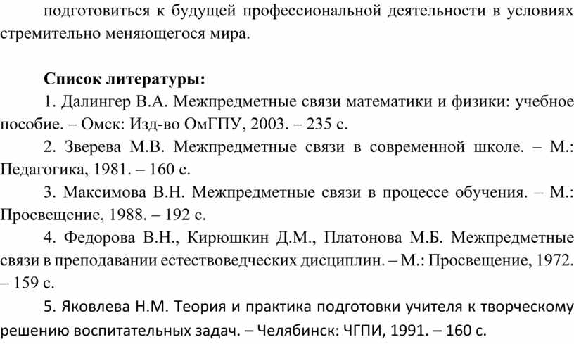 3. Максимова В.Н. Межпредметные связи в процессе обучения. – М.: Просвещение, 1988. – 192 с.