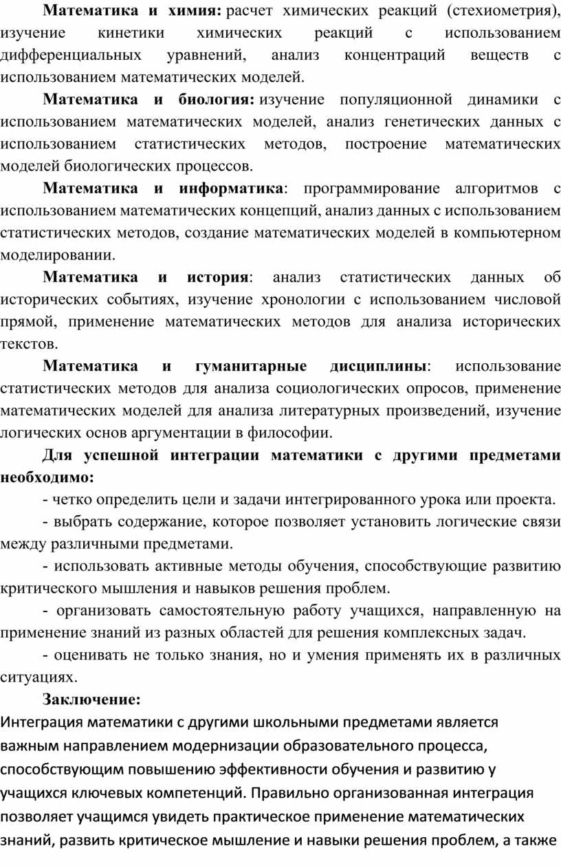 Для успешной интеграции математики с другими предметами необходимо: