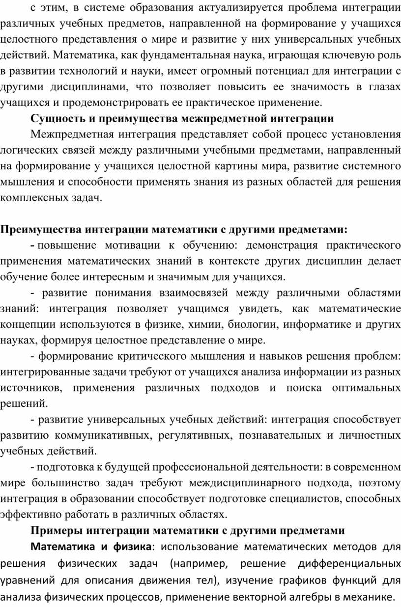 - описать преимущества интеграции математики с другими дисциплинами.