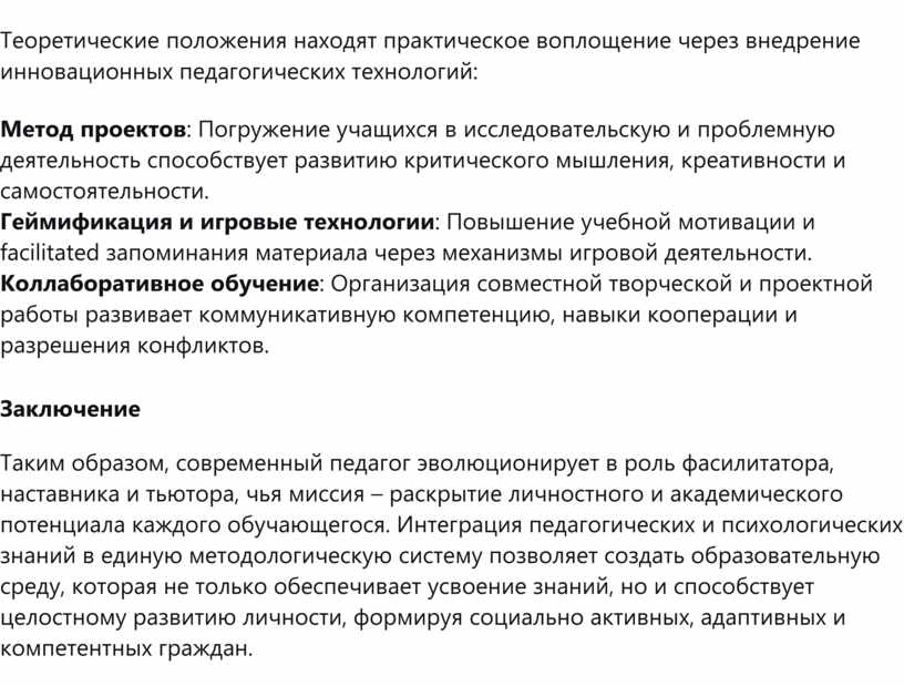 Таким образом, современный педагог эволюционирует в роль фасилитатора, наставника и тьютора, чья миссия – раскрытие личностного и академического потенциала каждого обучающегося. Интеграция педагогических и психологических знаний в единую методологическую систему позволяет создать образовательную среду, которая не только обеспечивает усвоение знаний, но и способствует целостному развитию личности, формируя социально активных, адаптивных и компетентных граждан.
