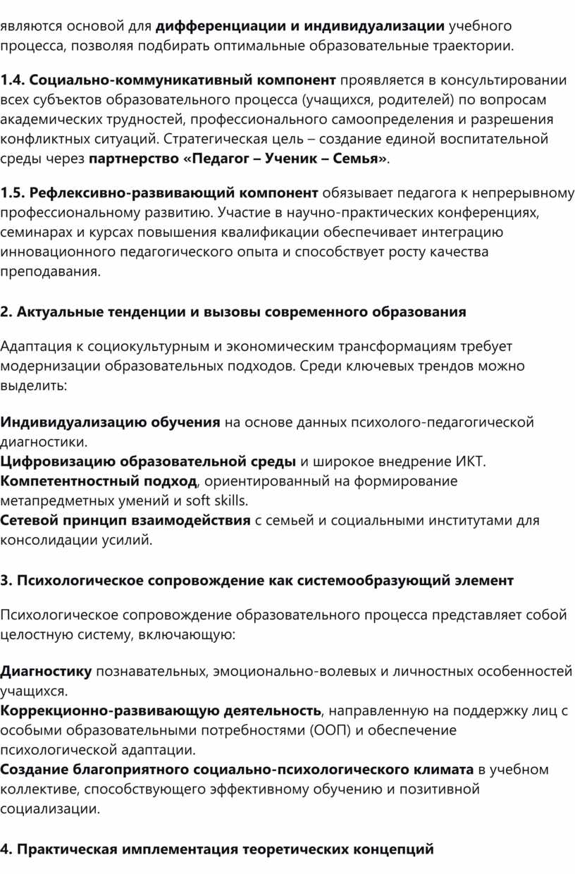 1.4. Социально-коммуникативный компонент проявляется в консультировании всех субъектов образовательного процесса (учащихся, родителей) по вопросам академических трудностей, профессионального самоопределения и разрешения конфликтных ситуаций. Стратегическая цель – создание единой воспитательной среды через партнерство «Педагог – Ученик – Семья».