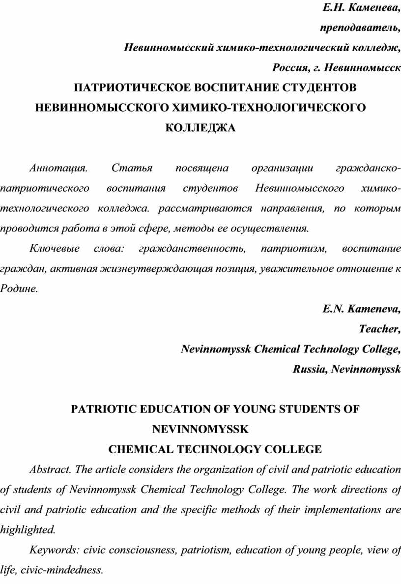 Аннотация. Статья посвящена организации гражданско-патриотического воспитания студентов Невинномысского химико-технологического колледжа. рассматриваются направления, по которым проводится работа в этой сфере, методы ее осуществления.