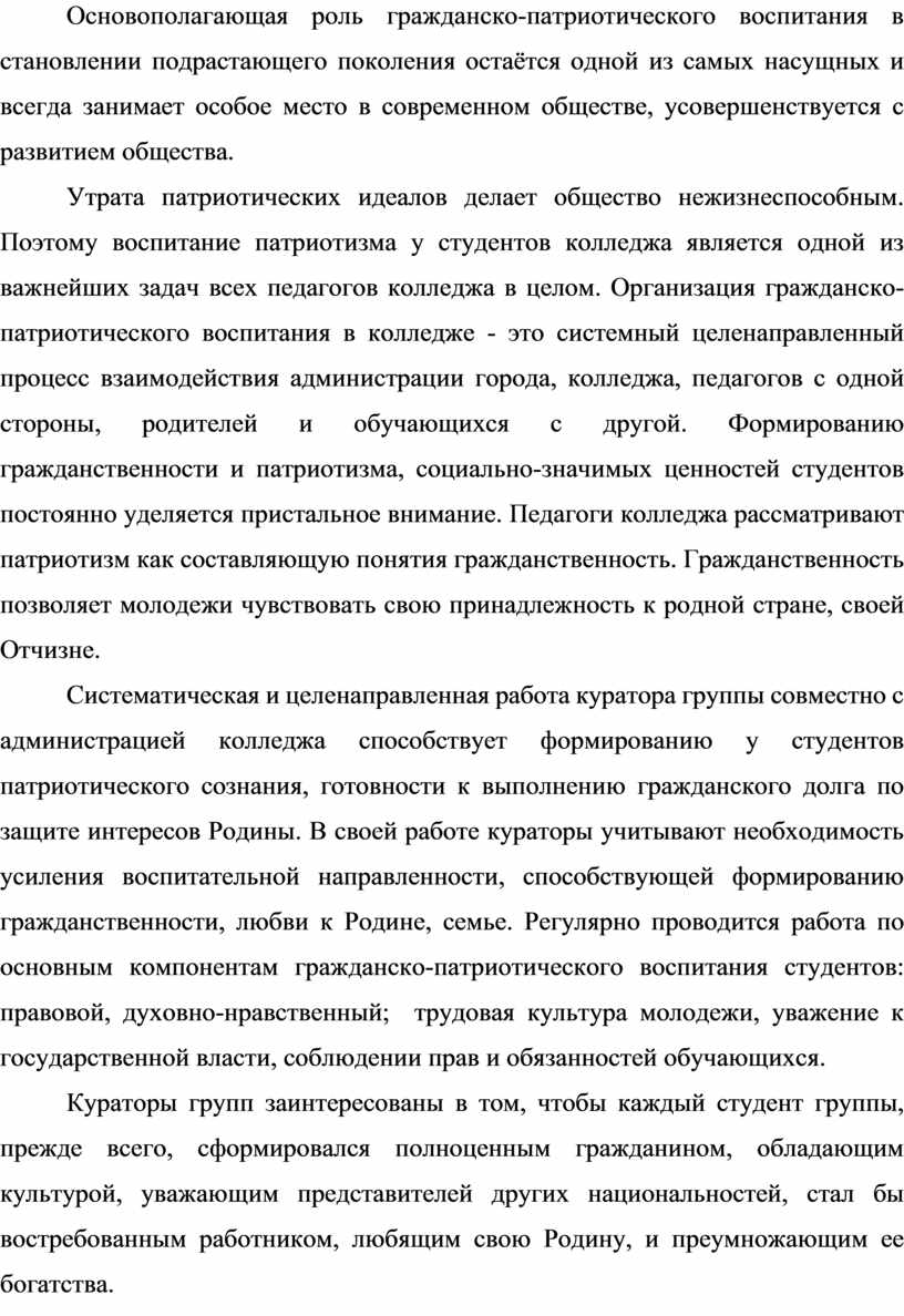 Систематическая и целенаправленная работа куратора группы совместно с администрацией колледжа способствует формированию у студентов патриотического сознания, готовности к выполнению гражданского долга по защите интересов Родины. В своей работе кураторы учитывают необходимость усиления воспитательной направленности, способствующей формированию гражданственности, любви к Родине, семье. Регулярно проводится работа по основным компонентам гражданско-патриотического воспитания студентов: правовой, духовно-нравственный; трудовая культура молодежи, уважение к государственной власти, соблюдении прав и обязанностей обучающихся.