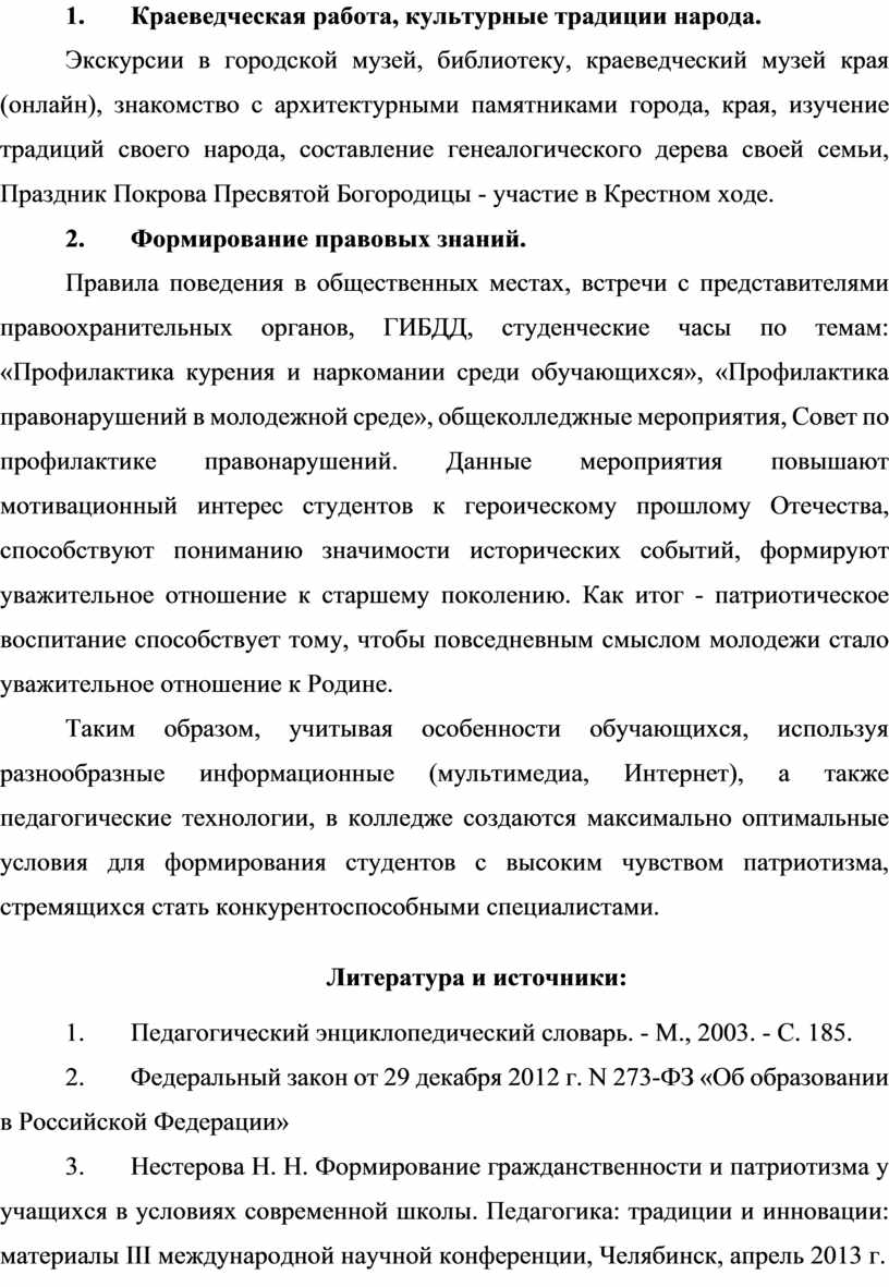 Правила поведения в общественных местах, встречи с представителями правоохранительных органов, ГИБДД, студенческие часы по темам: «Профилактика курения и наркомании среди обучающихся», «Профилактика правонарушений в молодежной среде», общеколледжные мероприятия, Совет по профилактике правонарушений. Данные мероприятия повышают мотивационный интерес студентов к героическому прошлому Отечества, способствуют пониманию значимости исторических событий, формируют уважительное отношение к старшему поколению. Как итог - патриотическое воспитание способствует тому, чтобы повседневным смыслом молодежи стало уважительное отношение к Родине.