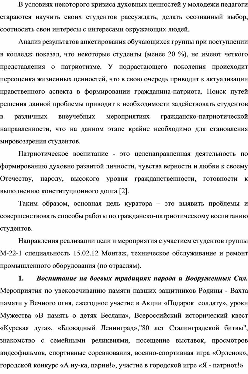 Таким образом, основная цель куратора – это выявить проблемы и совершенствовать способы работы по гражданско-патриотическому воспитанию студентов.