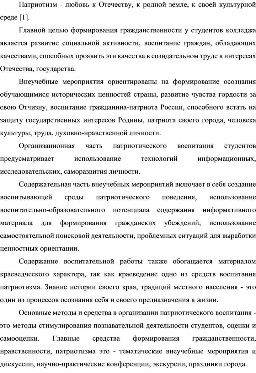 Утрата патриотических идеалов делает общество нежизнеспособным. Поэтому воспитание патриотизма у студентов колледжа является одной из важнейших задач всех педагогов колледжа в целом. Организация гражданско-патриотического воспитания в колледже - это системный целенаправленный процесс взаимодействия администрации города, колледжа, педагогов с одной стороны, родителей и обучающихся с другой. Формированию гражданственности и патриотизма, социально-значимых ценностей студентов постоянно уделяется пристальное внимание. Педагоги колледжа рассматривают патриотизм как составляющую понятия гражданственность. Гражданственность позволяет молодежи чувствовать свою принадлежность к родной стране, своей Отчизне.