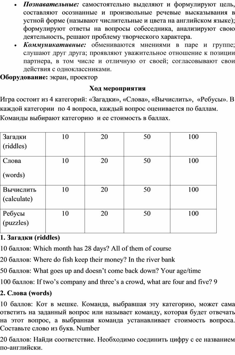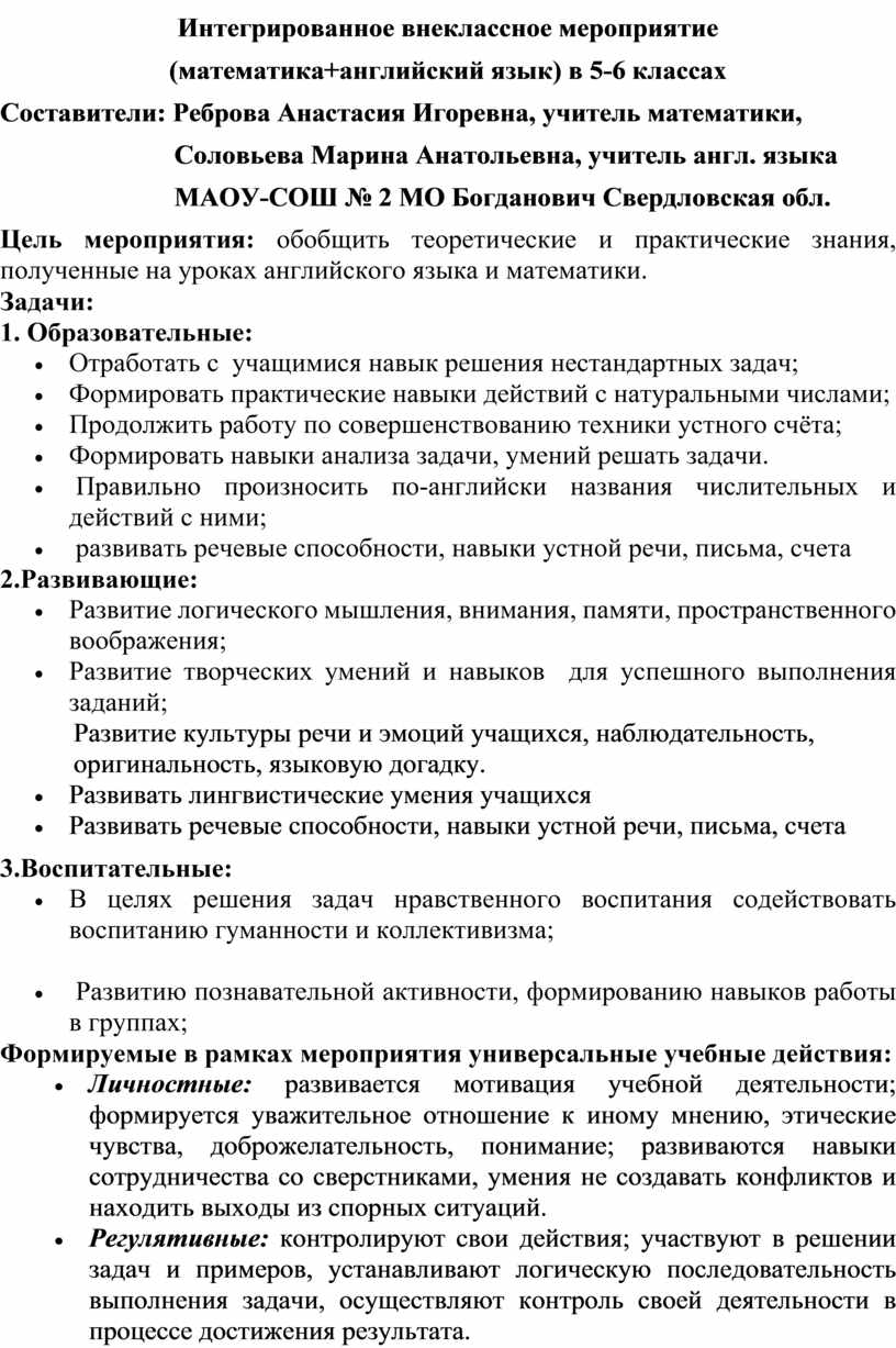Цель мероприятия: обобщить теоретические и практические знания, полученные на уроках английского языка и математики.