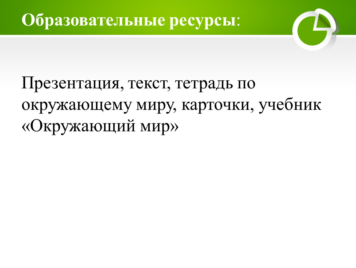 Презентация, текст, тетрадь по окружающему миру, карточки, учебник «Окружающий мир»