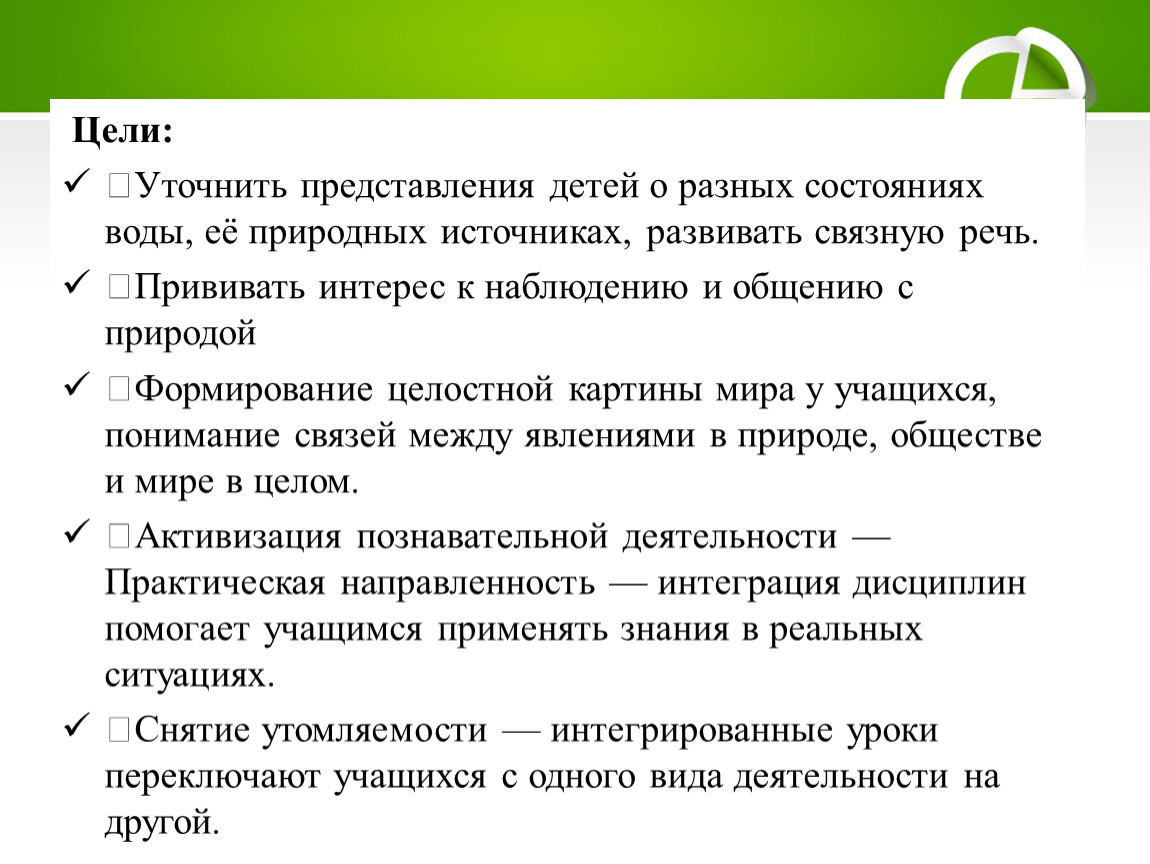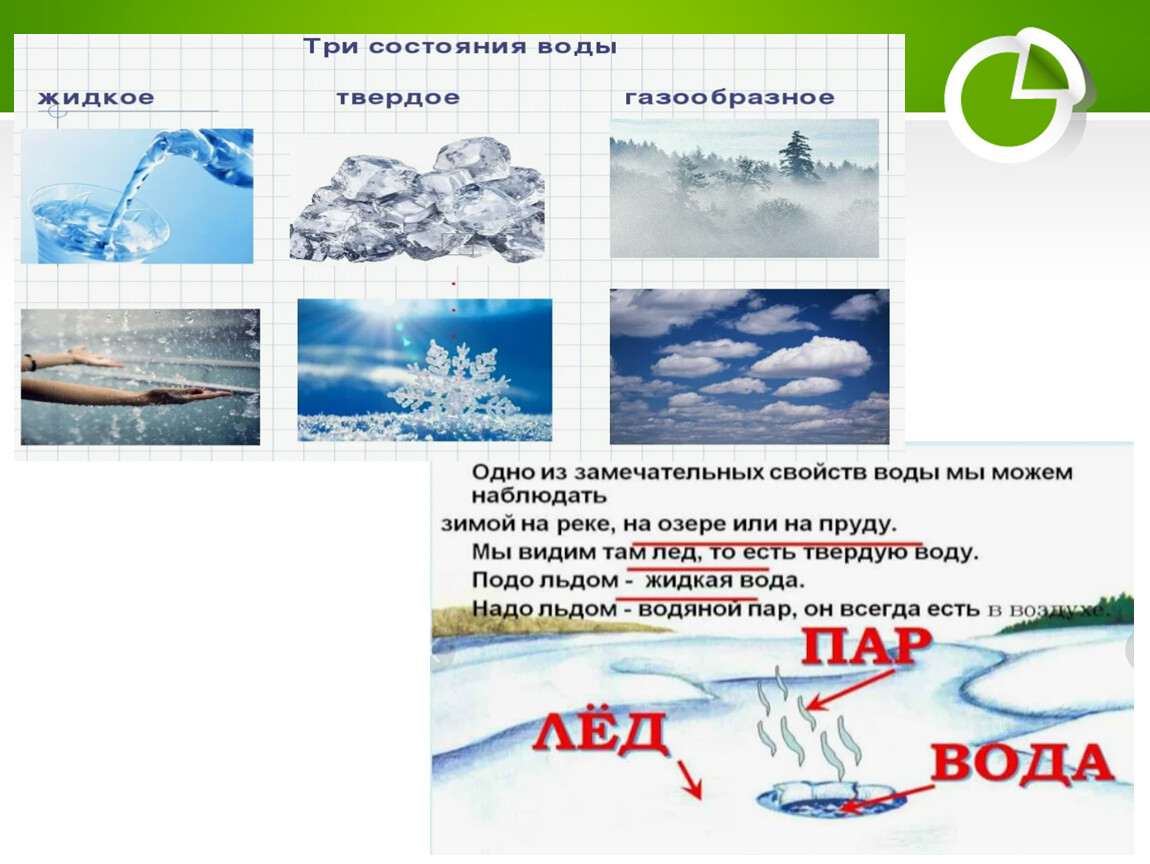 Уточнить представления детей о разных состояниях воды, её природных источниках, развивать связную речь.