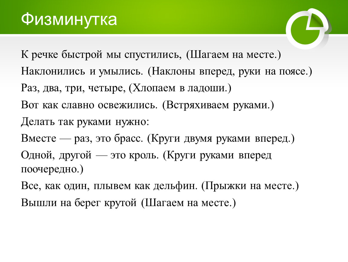 Одной, другой — это кроль. (Круги руками вперед поочередно.)