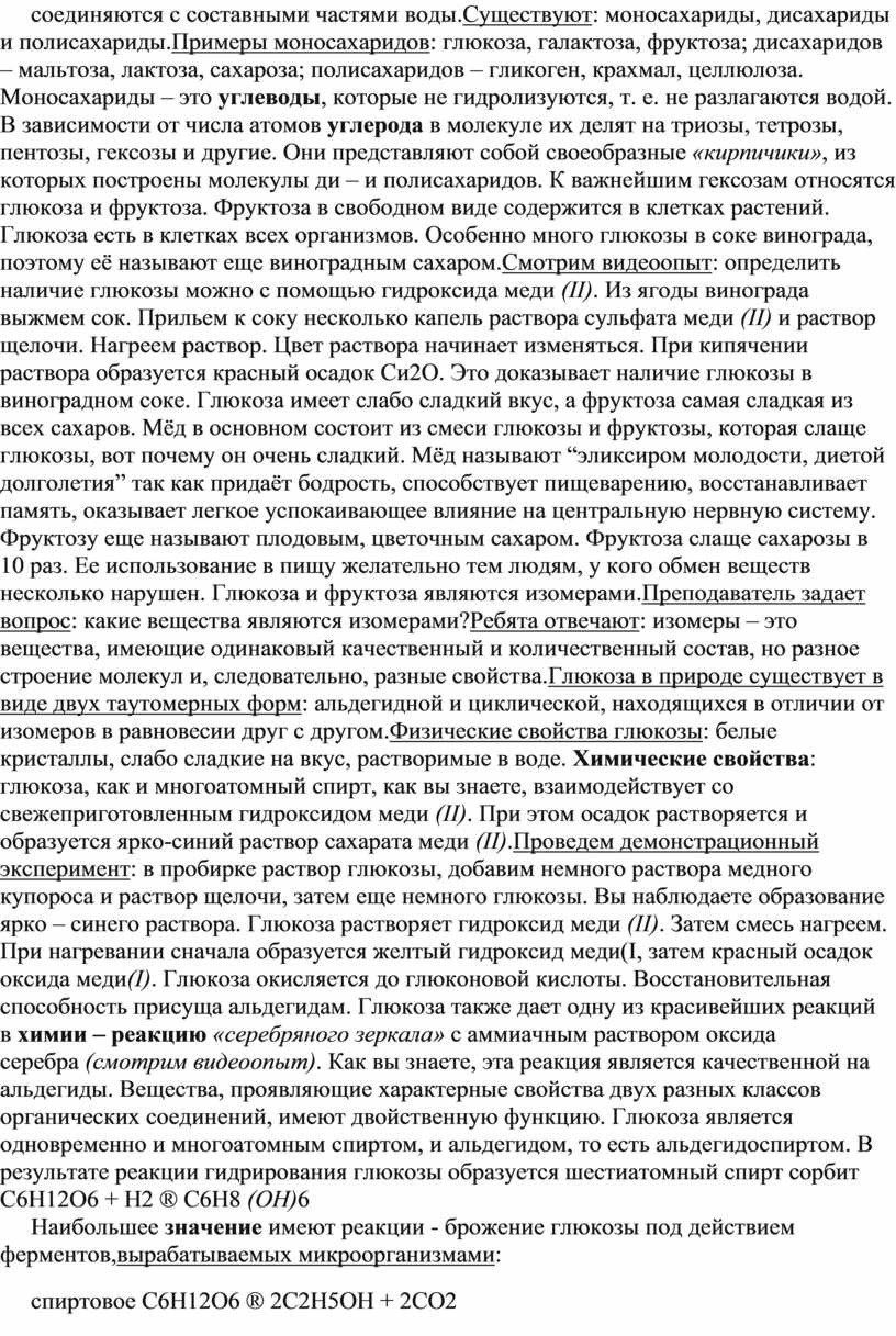 Преподаватель ставит проблему: если взять стакан воды и растворить ложку сахара, предварительно попробовав на вкус, затем прокипятить этот раствор и снова попробовать на вкус, то прокипяченный раствор будет слаще. Почему?Ребята отвечают: при гидролизе сахарозы образуется кроме глюкозы фруктоза, которая в 10 раз слаще сахарозы. Преподаватель просит обучающихся вспомнить что это за вещества электролиты?Ребята отвечают: водные растворы некоторых веществ являются проводниками электрического тока. Электролитами являются кислоты, основания и соли.Преподаватель: водный раствор сахара является электролитом?Ребята отвечают: нет, так как он не проводит электрический ток.