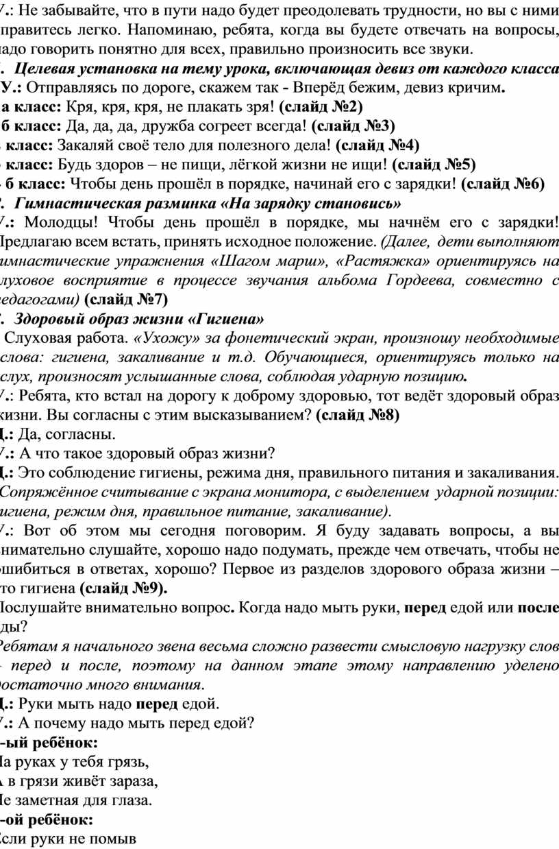 Учитель (Далее У.): Здравствуйте, дорогие ребята! Сегодня у нас необычная встреча, мы с вами продолжаем путь по дороге к доброму здоровью. Спасибо всем вам за то, что вы приняли активное участие в конкурсе рисунков «ЗдОрово здорово жить!». Многие из этих рисунков представлены в этом кабинете. Очень рада, что мы побывали в Стране здоровья, где вы показали свою сноровку, силу, ловкость, знания и умения. Стихи читают заранее подготовленные дети 4-ого класса.