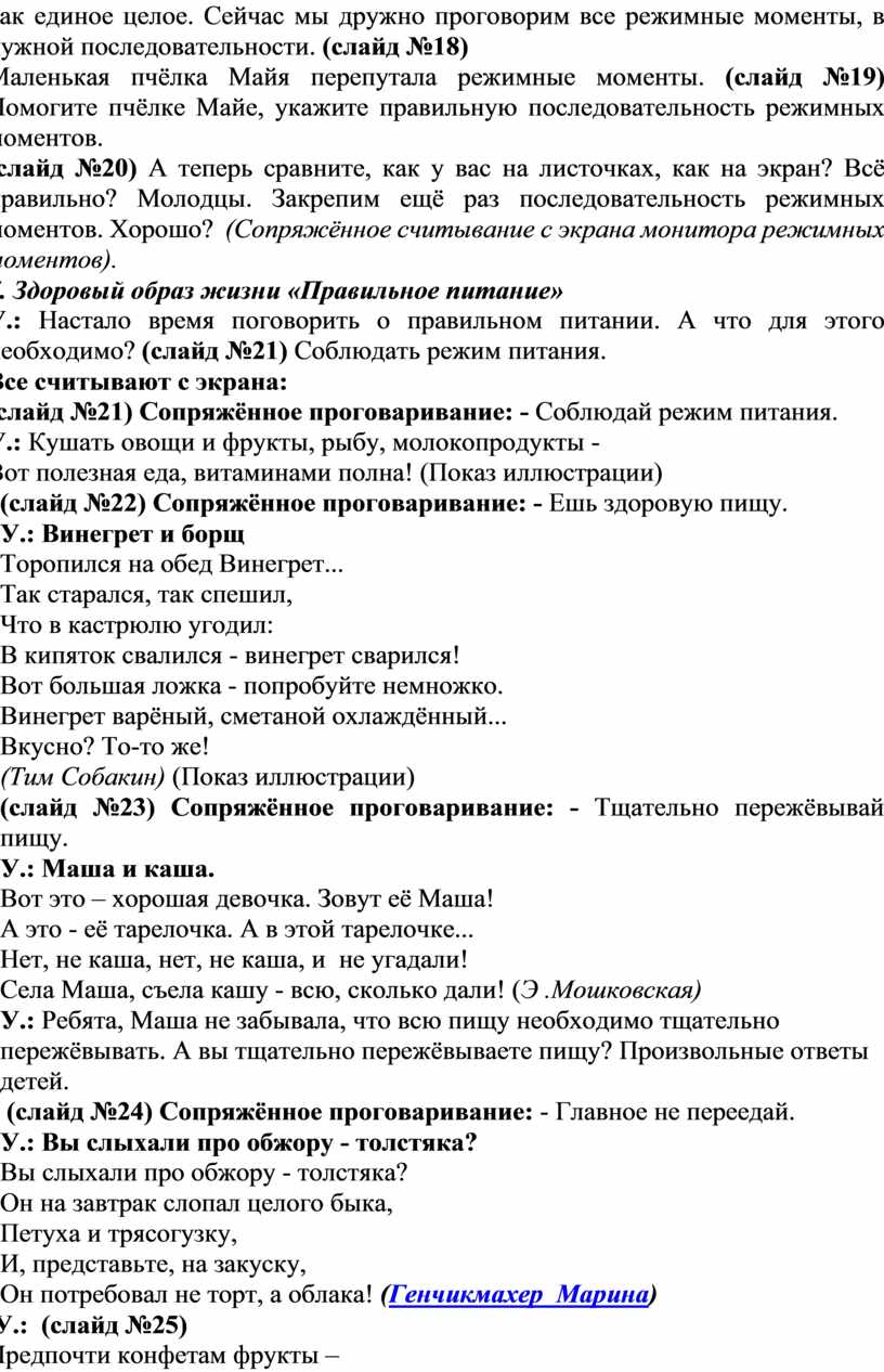(слайд №20) А теперь сравните, как у вас на листочках, как на экран? Всё правильно? Молодцы. Закрепим ещё раз последовательность режимных моментов. Хорошо? (Сопряжённое считывание с экрана монитора режимных моментов).