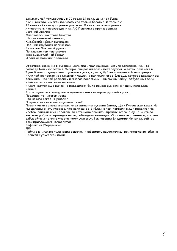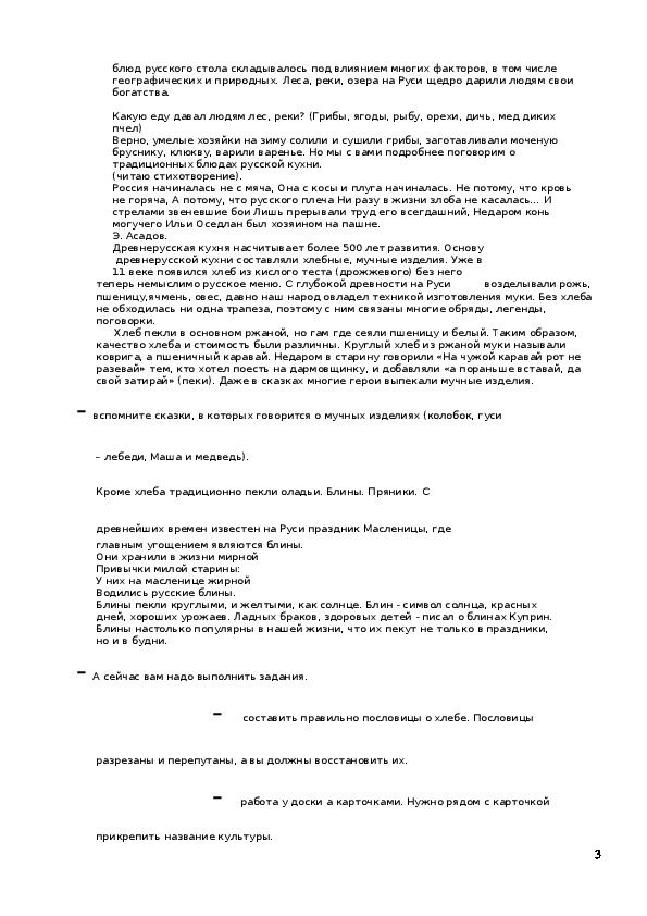русской кулинарной культуре. Развивающая - развитие ин тереса к своей истории.