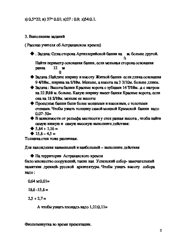 Цели урока: повторить действия над десятичными и обыкновенными дробями; развивать познавательную активность, познакомить с историей Астраханского кремля ; воспитывать любовь к родному краю; Поднимает руки класс-это “ раз”.