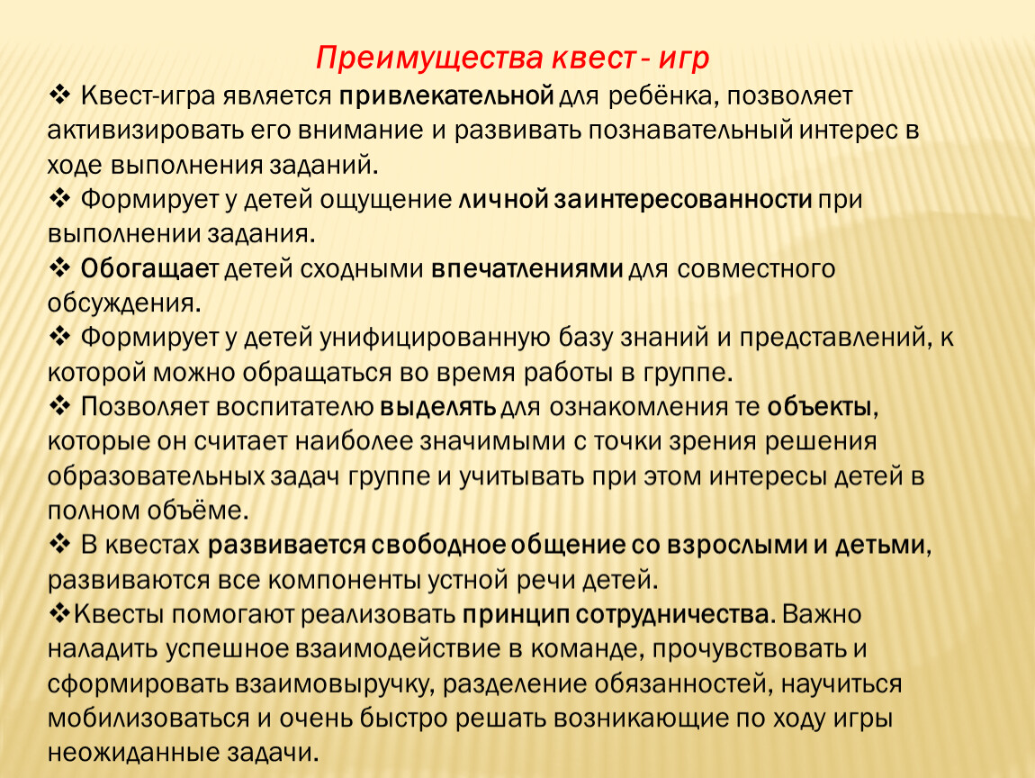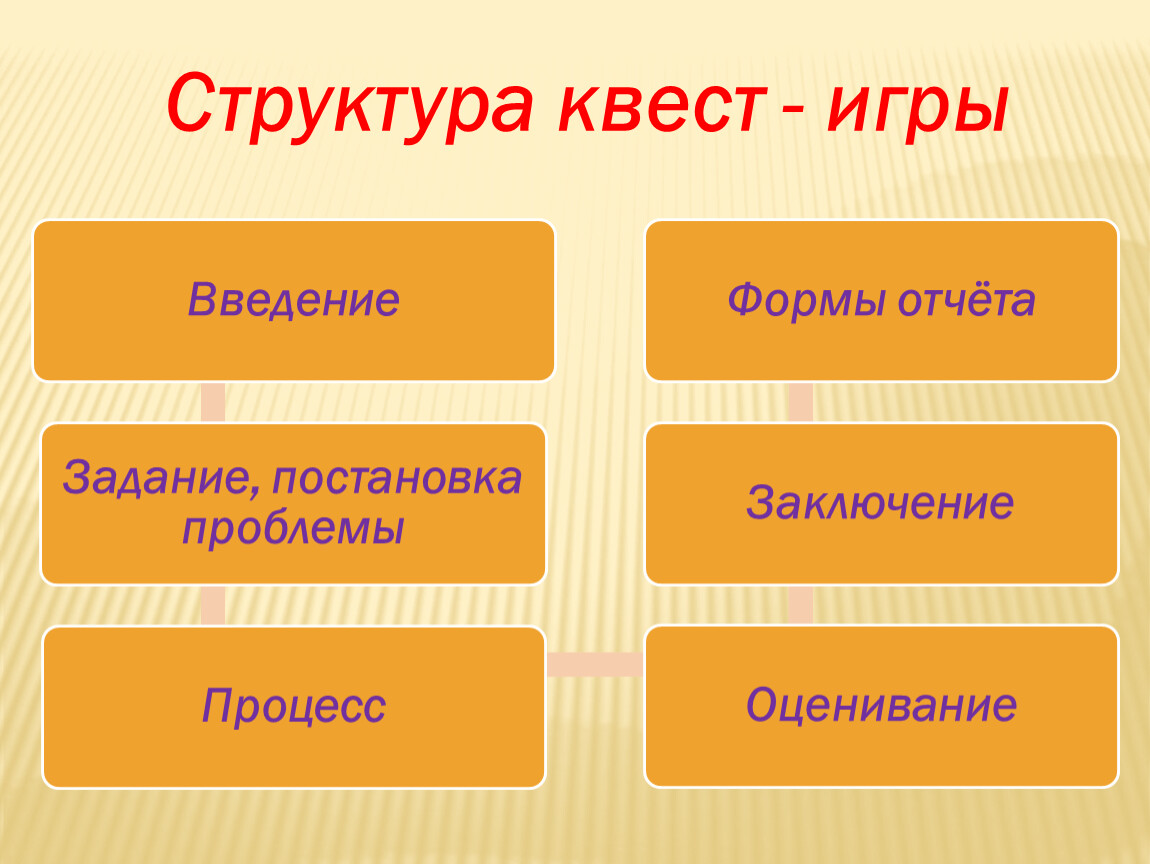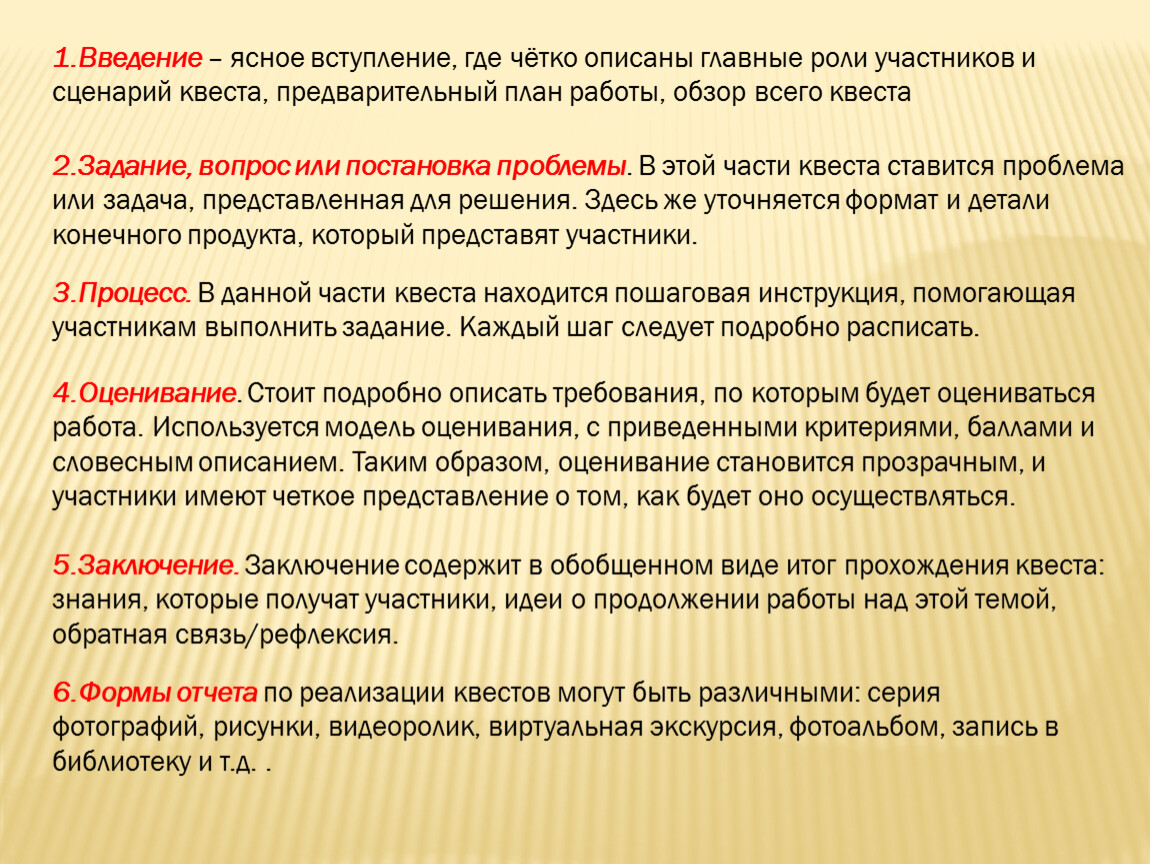 1.Введение – ясное вступление, где чётко описаны главные роли участников и сценарий квеста, предварительный план работы, обзор всего квеста