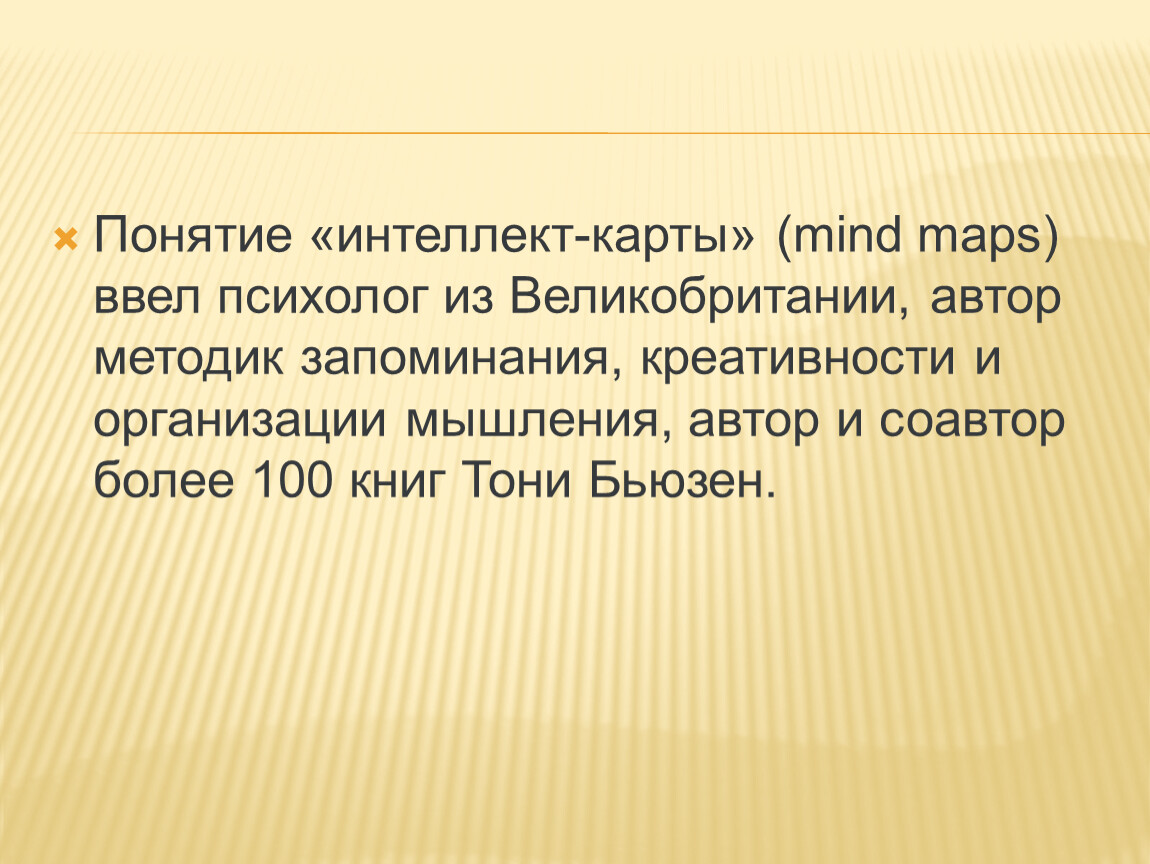 Понятие «интеллект-карты» (mind maps) ввел психолог из Великобритании, автор методик запоминания, креативности и организации мышления, автор и соавтор более 100 книг Тони Бьюзен.