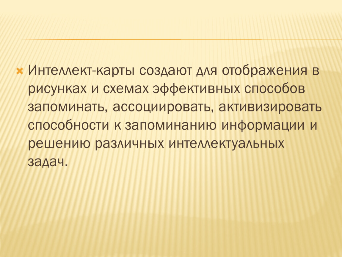 Интеллект-карты создают для отображения в рисунках и схемах эффективных способов запоминать, ассоциировать, активизировать способности к запоминанию информации и решению различных интеллектуальных задач.