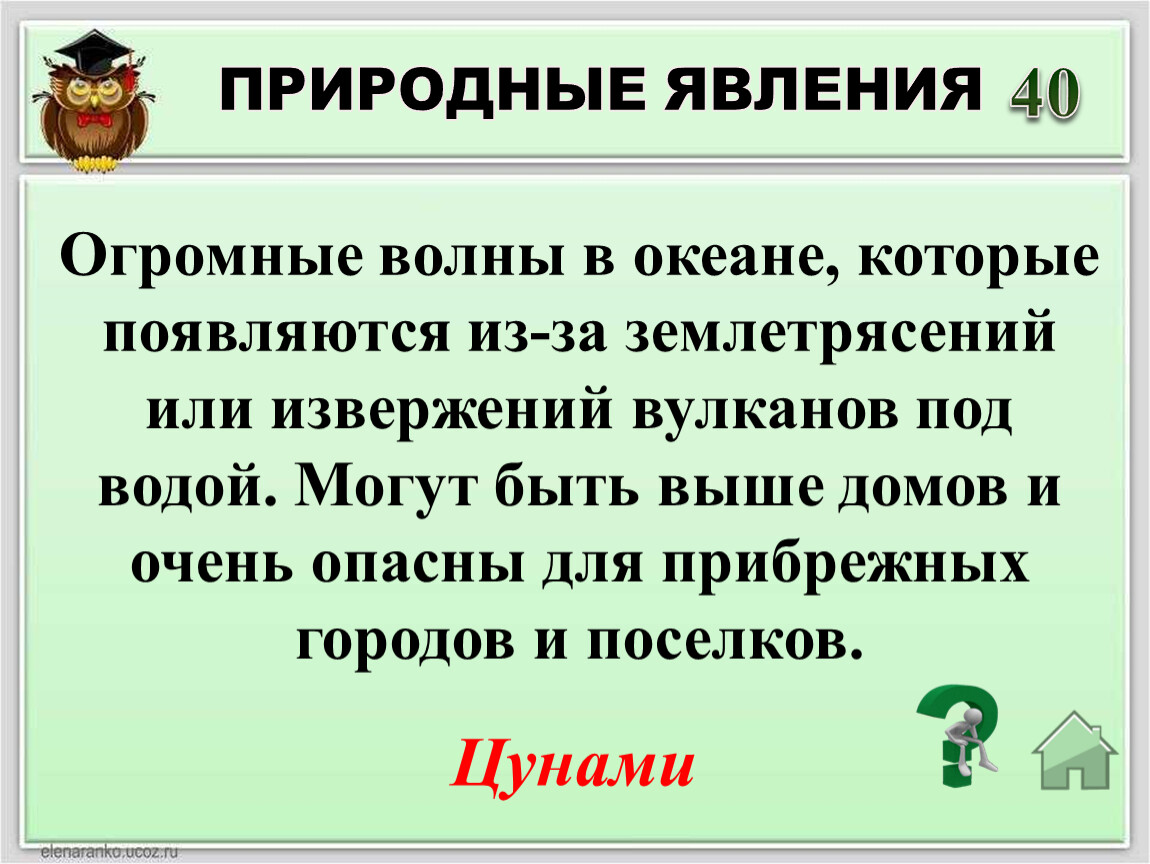 Огромные волны в океане, которые появляются из-за землетрясений или извержений вулканов под водой. Могут быть выше домов и очень опасны для прибрежных городов и поселков.