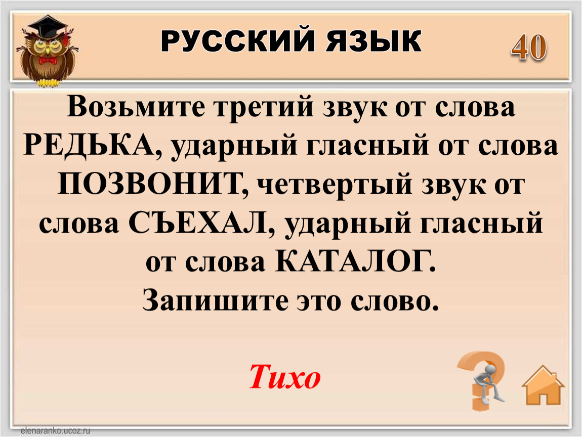 Возьмите третий звук от слова РЕДЬКА, ударный гласный от слова ПОЗВОНИТ, четвертый звук от слова СЪЕХАЛ, ударный гласный от слова КАТАЛОГ.