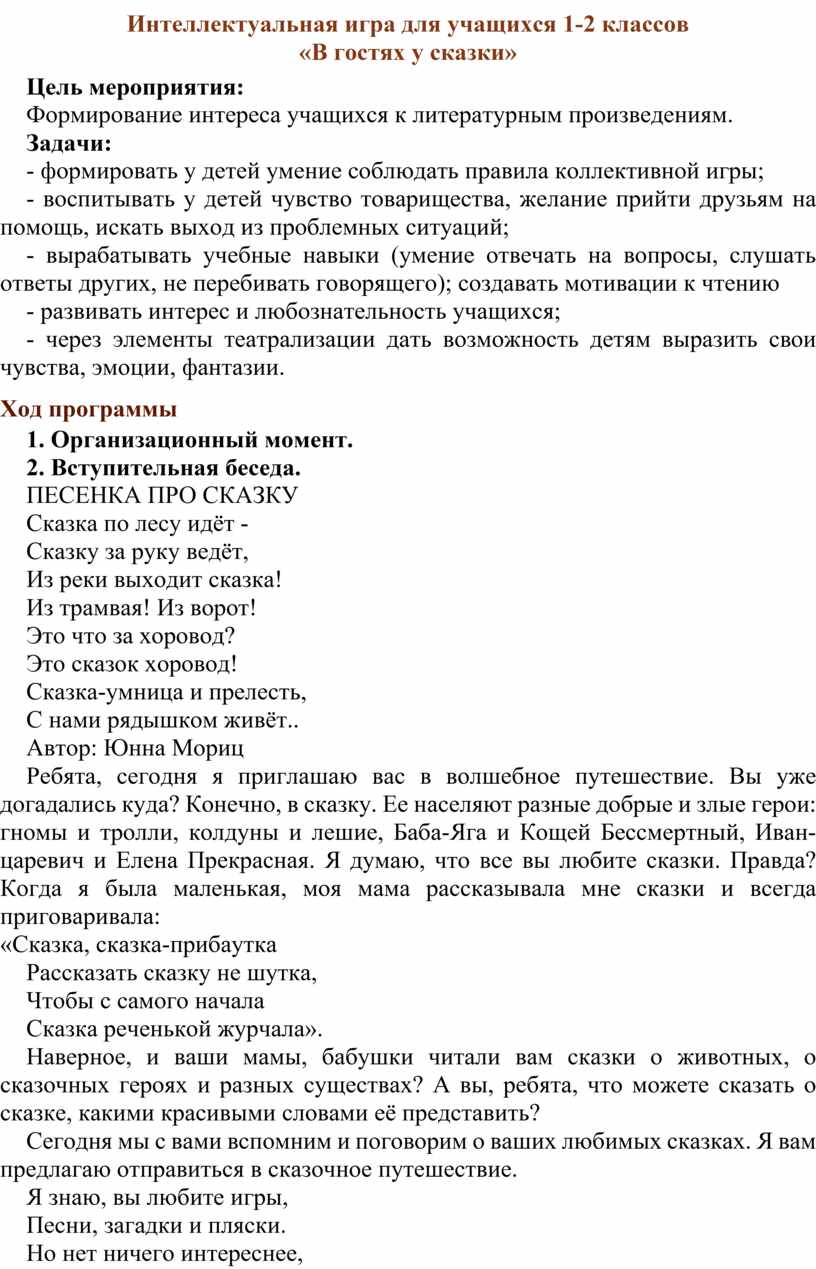 Интеллектуальная игра для учащихся 1-2 классов «В гостях у сказки»