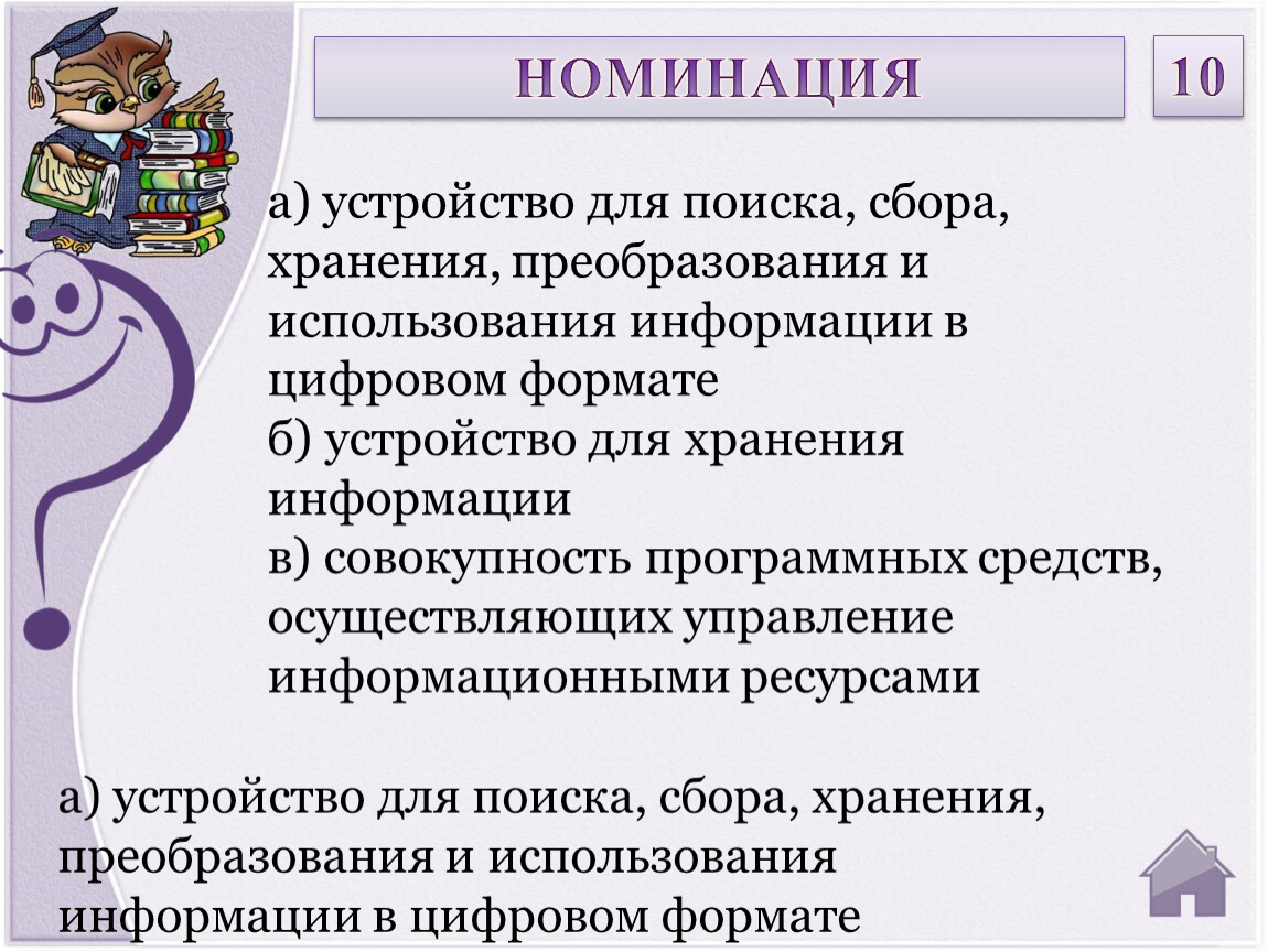 а) устройство для поиска, сбора, хранения, преобразования и использования информации в цифровом формате б) устройство для хранения информациив) совокупность программных средств, осуществляющих управление информационными ресурсами