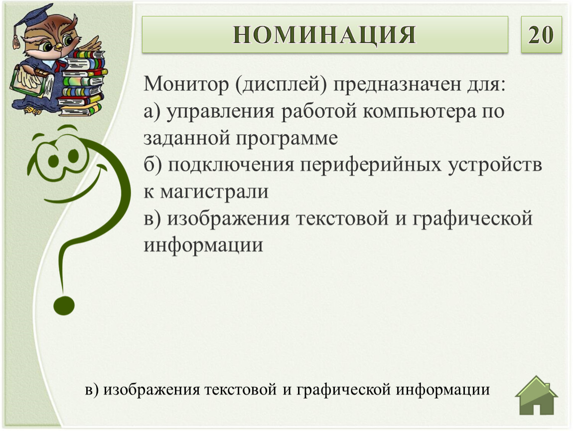 Монитор (дисплей) предназначен для:а) управления работой компьютера по заданной программеб) подключения периферийных устройств к магистралив) изображения текстовой и графической информации