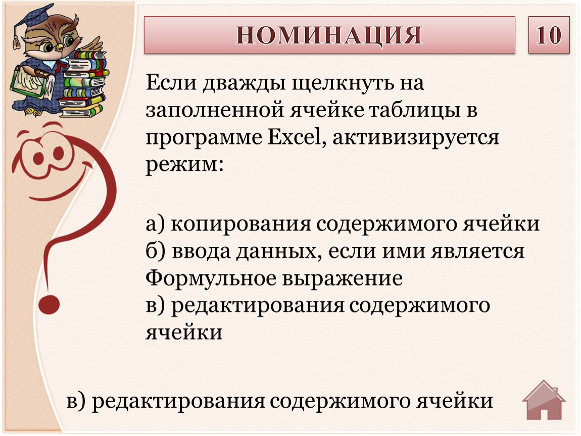 в) редактирования содержимого ячейки