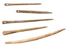 На тупом конце рыбьи кости просверливали дырку. Но настоящей же «костью», только из металла, мы пользуемся и сегодня. Использовали терновые колючки, затем колючки стали делать из бронзы. Стальные в Европе взяли в 14 столетии, когда изведали тайну крепкой дамасской замерзли. Ушко сперва делать не умели - просто завертывали тупой краешек.