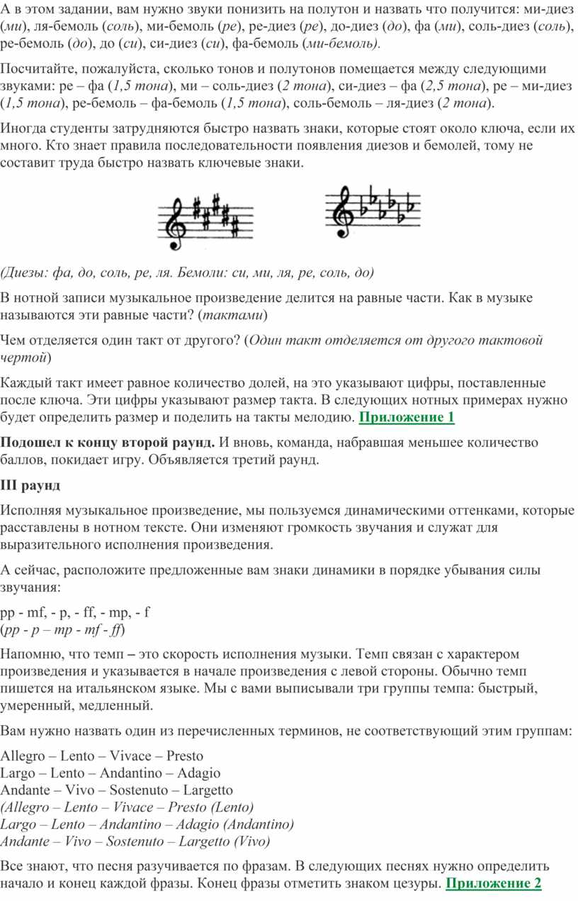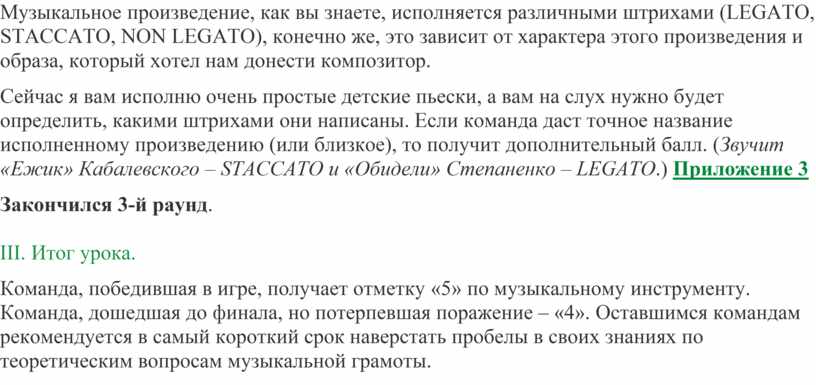 Сейчас я вам исполню очень простые детские пьески, а вам на слух нужно будет определить, какими штрихами они написаны. Если команда даст точное название исполненному произведению (или близкое), то получит дополнительный балл. (Звучит «Ежик» Кабалевского – STACCATO и «Обидели» Степаненко – LEGATO.) Приложение 3