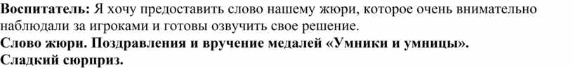 Воспитатель: Я хочу предоставить слово нашему жюри, которое очень внимательно наблюдали за игроками и готовы озвучить свое решение.