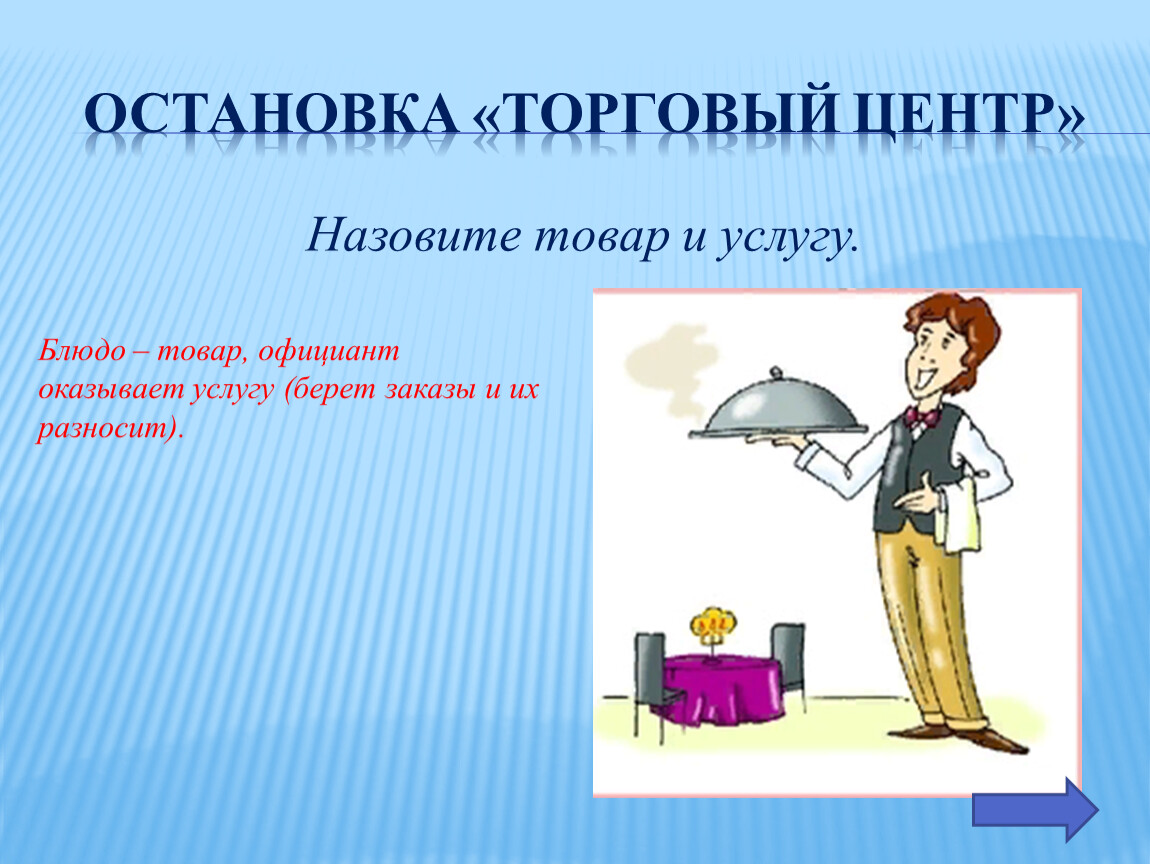 Блюдо – товар, официант оказывает услугу (берет заказы и их разносит).