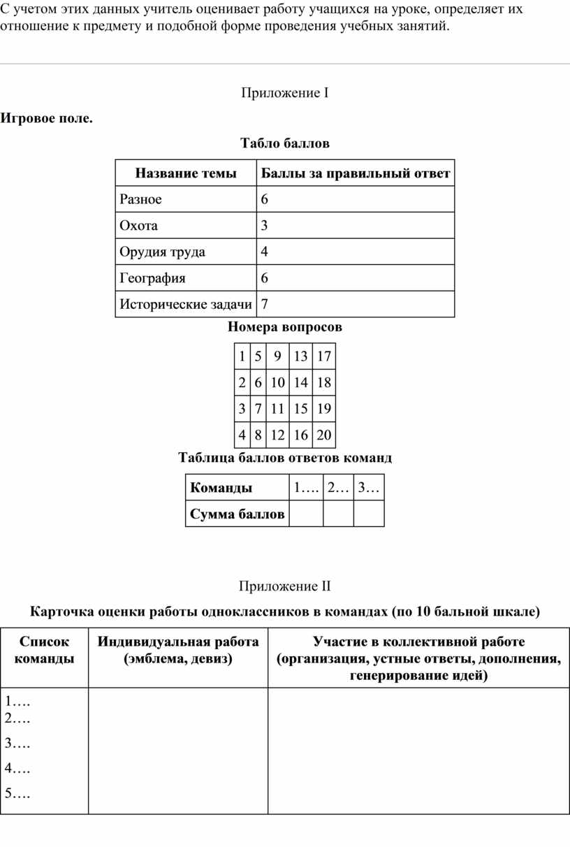В конце занятия каждому игроку предлагается оценить работу одноклассников в своей команде и заполнить карточку (см. Приложение II).