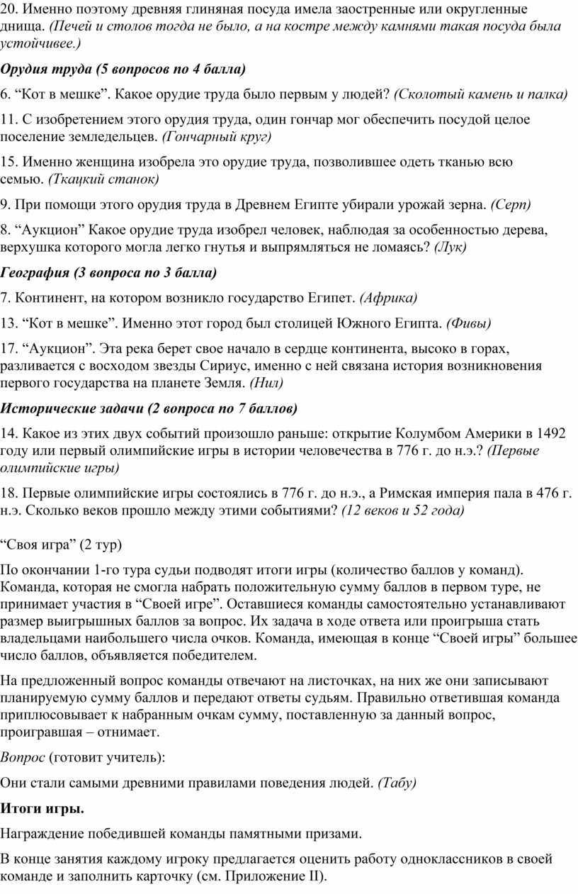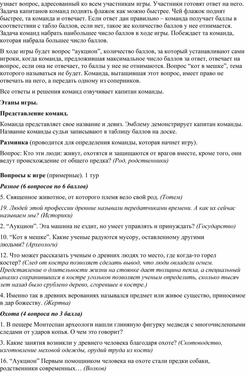 Подготовка урока: создается инициативная группа учеников (5 человек), которым предлагается разработать вопросы для игры по темам: разное, охота, орудия труда, география и исторические задачи.