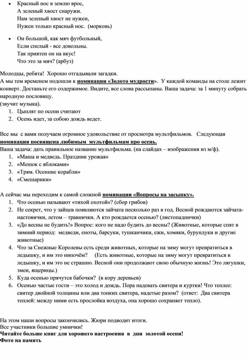 Переходим к номинации «Сказочная осень». В этой номинации вас ждут задания по сказкам. Кто много читает, тот легко справится с вопросами. (вопросы задают командам по очереди)