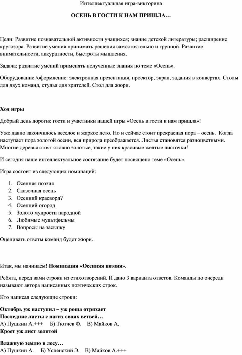 И сегодня наше интеллектуальное состязание будет посвящено теме «Осень».