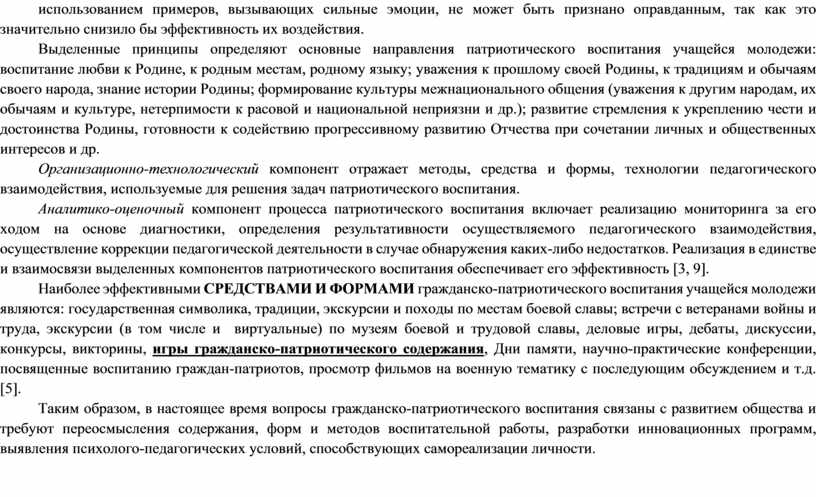 Наиболее эффективными СРЕДСТВАМИ И ФОРМАМИ гражданско-патриотического воспитания учащейся молодежи являются: государственная символика, традиции, экскурсии и походы по местам боевой славы; встречи с ветеранами войны и труда, экскурсии (в том числе и виртуальные) по музеям боевой и трудовой славы, деловые игры, дебаты, дискуссии, конкурсы, викторины, игры гражданско-патриотического содержания, Дни памяти, научно-практические конференции, посвященные воспитанию граждан-патриотов, просмотр фильмов на военную тематику с последующим обсуждением и т.д. [5].