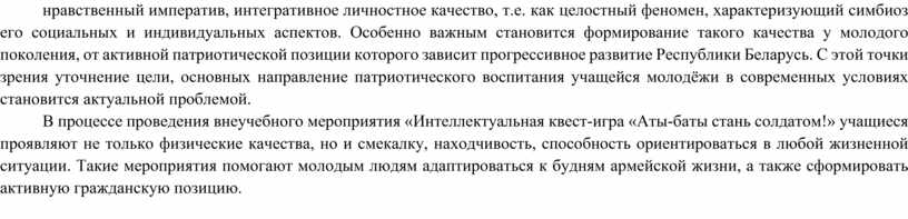В процессе проведения внеучебного мероприятия «Интеллектуальная квест-игра «Аты-баты стань солдатом!» учащиеся проявляют не только физические качества, но и смекалку, находчивость, способность ориентироваться в любой жизненной ситуации. Такие мероприятия помогают молодым людям адаптироваться к будням армейской жизни, а также сформировать активную гражданскую позицию.