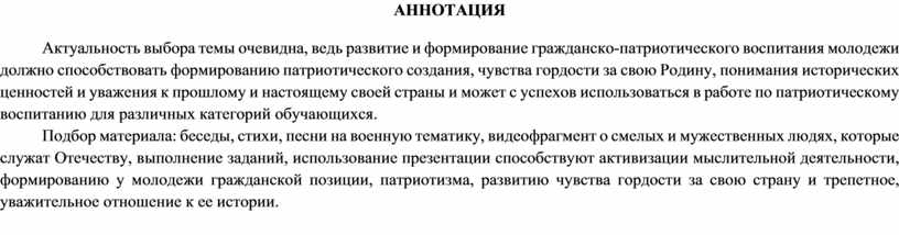 Актуальность выбора темы очевидна, ведь развитие и формирование гражданско-патриотического воспитания молодежи должно способствовать формированию патриотического создания, чувства гордости за свою Родину, понимания исторических ценностей и уважения к прошлому и настоящему своей страны и может с успехов использоваться в работе по патриотическому воспитанию для различных категорий обучающихся.