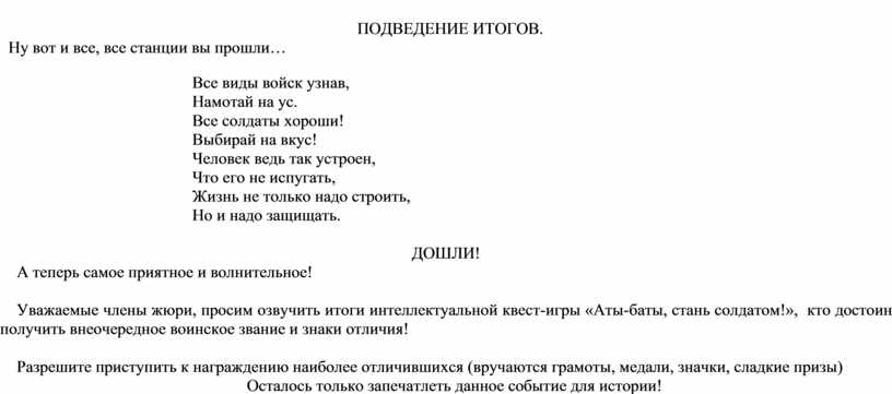 - Товарищ капитан, разрешите доложить: учебные группы для проведения мероприятия «Интеллектуальная квест-игра «Аты-баты, стань солдатом!» собрались в полном составе. Разрешите начать игру!